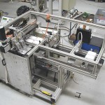 Auf die positionierten Blister kommen jetzt die Kartondeckel aufgesetzt. Die Kartondeckel werden paarweise über ein NC-Handling aus zwei Magazintürmen zugeführt. Anschließend erfolgt die seitliche Ultraschallverschweißung der beiden Kartons mit den Blistern.